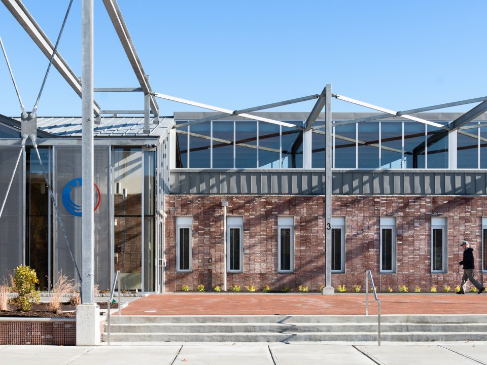 A large, grassy lawn contains a support station for bicyclists and the new pedestrian bridge over the Blackstone River invites visitors to engage with the river and the associated ecology. The large lawn also caps the contaminated soils below allowing for safe public use of the area. With its location at a major entry point to the city, the visitor center has become a gateway and source of pride for local residents.